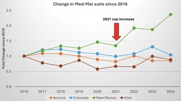 Before the changes in the 2021 Malpractice Act, malpractice lawsuits in New Mexico remained relatively flat. Since 2021, cases have increased by 185%. Neighboring states (Colorado, Arizona and Utah) have not had a similar rise.